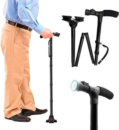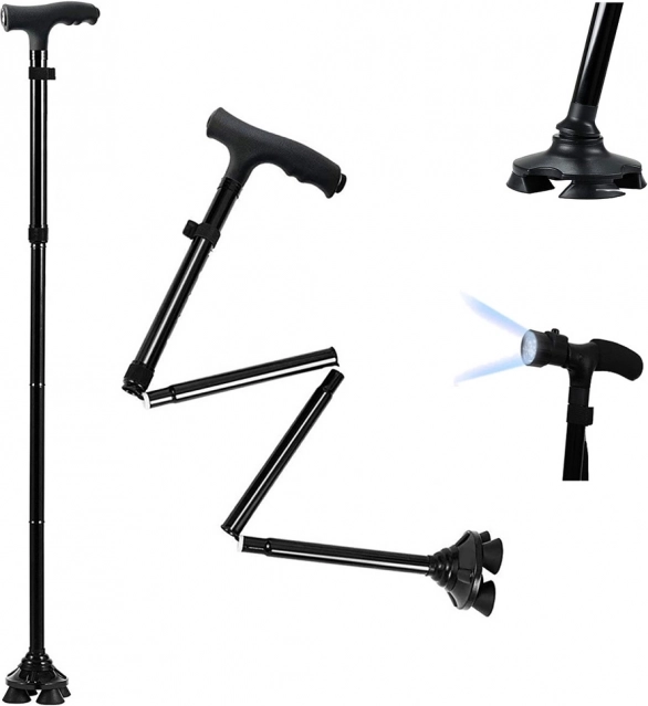Sklopivi štap s LED svjetlom idealno je rješenje za osobe s poteškoćama u kretanju. Izrađen je od kvalitetnih i izdržljivih materijala te posjeduje malu težinu, što jamči maksimalnu udobnost i jednostavnu uporabu. Štap se sam održava u uspravnom položaju zahvaljujući potpori s 4 točke i rotirajućem zglobu od 360°.