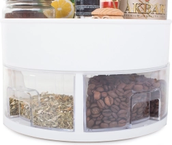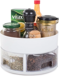 Održavajte red u kuhinji s univerzalnim rotirajućim organizatorom koji elegantno ukroćuje začine, rasute namirnice, kavu, čaj i male kuhinjske potrepštine. Stabilna rotirajuća baza osigurava glatku rotaciju od 360°, pa do svega lako dođete jednim pokretom. Četiri izvadive ladice s prozirnim stijenkama pružaju trenutan uvid u sadržaj i olakšavaju dopunjavanje.
