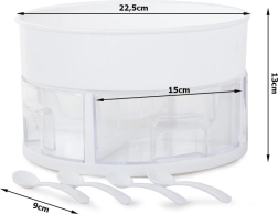 Organizator je prikladan i za ormarić i za radnu plohu – štedi prostor, drži stvari na svom mjestu i izgleda čisto i moderno. U paketu se nalaze 4 plastične žličice za svaki pretinac posebno, zahvaljujući kojima ćete doziranje uvijek imati pri ruci.