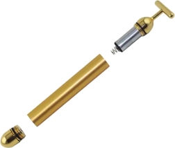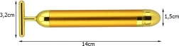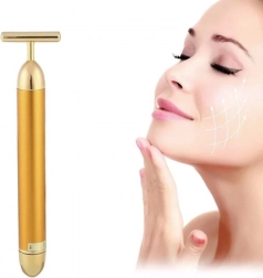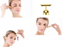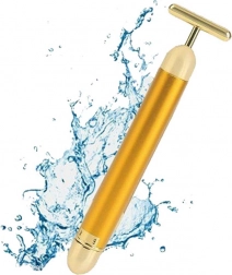 Zlatni T-bar masažer koristi nježne vibracije za stimulaciju kože, čime pomaže njezinom zatezanju i posvjetljivanju. Redovita masaža poboljšava mikrocirkulaciju i može poduprijeti bolje upijanje krema i seruma. Prikladan je za sve tipove kože, uključujući osjetljivo područje oko očiju.