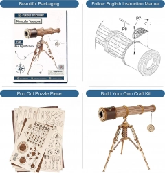 Sastavite svoj vlastiti drveni model dalekozora iz serije ROBOTIME Rokr Curious Discovery, koji možete koristiti sa stalkom ili bez njega. Ovaj model nije samo prekrasni dekorativni element, već također podržava razvoj fine motorike i mašte.