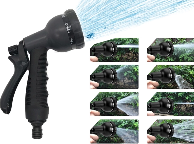 Paket također uključuje multifunkcionalni pištolj za prskanje s osam načina prskanja. Jednostavno zaključavanje okidača pomoću metalne kuke omogućava vam da ravnomjerno distribuirate vodu, bez potrebe za stalnim pritiskanjem. Ergonomska protuklizna drška osigurava ugodno i sigurno držanje.