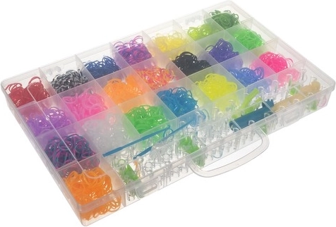 Ogroman set XXL – Naš set sadrži sve potrebne elemente za izradu prekrasnih narukvica ili drugih predmeta od gumica. U pakiranju ćete pronaći gumice, kukice, prak i tkalački stan.