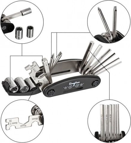 Sve potrebno na jednom mjestu: imbus ključevi, odvijači, nasadni ključevi i ključ za žbice. Idealno za brze popravke i podešavanja bicikla bilo gdje.