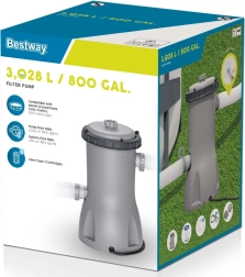 Filtracijska pumpa Bestway s protokom 3028 l/h može prebaciti do 3028 litara vode na sat. Ispravna odabir filtracijske pumpe ključan je za njezin učinak i efikasnost. Za ispravan rad pumpe potrebni su zamjenjivi filteri. Jedan papirnati filter uključen je u paket i može se očistiti ispiranjem pod tekućom vodom. Preporučuje se zamjena filtera svaka dva tjedna. Pumpa je jednostavna za montažu i upravljanje, a paket sadrži upute na hrvatskom. Filtracijska pumpa nužni je dio filtracijskog sustava bazena, pomaže održavanju čiste i sigurne vode.