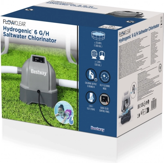 | Uređaj za čišćenje vode u bazenima, prikladan za sve vrste izvora vode. | - kompatibilan s bazenima do 7000 gal (26 498 l) i zahtijeva minimalni protok od 330 gal (1 249 l), - koristi sol za proizvodnju klora koji održava bazen čistim, a ujedno je nježan prema koži, očima i kosi, - jednostavna upravljačka ploča s funkcijom automatskog zaključavanja, - automatski samostalni način čišćenja, - sadrži adaptere za većinu bazena, - sadrži 50 testnih trakica, - izlaz klora 6 g/h. | .