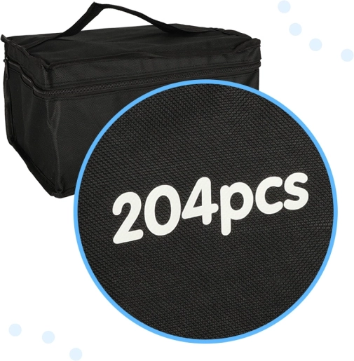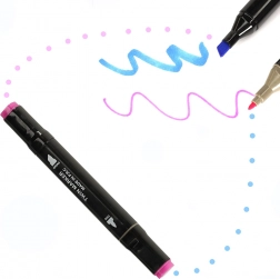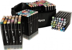 Svaki marker ima dva vrha – široki za brzo bojanje većih površina i tanki za precizne linije i detalje. Praktični stalak drži boje pri ruci i pregledno, dok torbica s patentnim zatvaračem olakšava prenošenje cijelog seta.