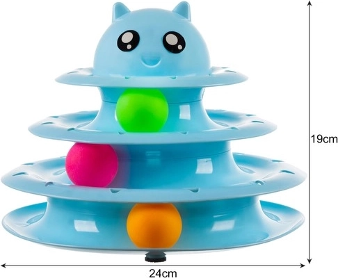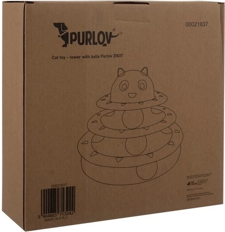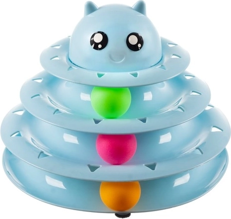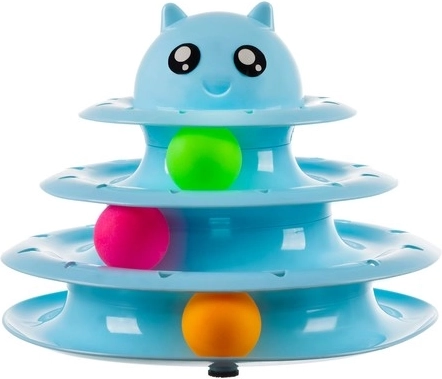 Toranj se sastoji od tri razine na kojima su smještene šarene loptice. Loptice se lako okreću i potiču mačke na interakciju. Toranj je od izdržljive plastike koja dugo traje.