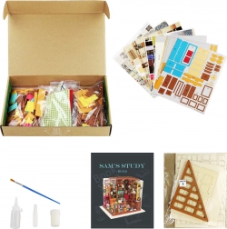 Sve potrebno dio je pakiranja – od predrezanih dijelova od šperploče preko papirnatih i tekstilnih elemenata pa do ljepila, boja i kista. Sastavljanje uključuje bojanje i lijepljenje, rad s sitnim detaljima i strpljivo sklapanje, što ga čini idealnim projektom za miran vikend.