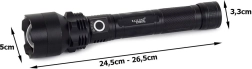 Robusno kućište od zrakoplovnog aluminija s tvrdo eloksiranom površinom otporno je na udarce i zaštićeno je prema IPX5. Protuklizna površina, ergonomska ručka i remen povećavaju sigurnost držanja. Dva akumulatora 26650 osiguravaju dugu autonomiju, USB punjenje praktično je na terenu, a LED indikator prikazuje stanje napunjenosti. Dostupna su 3 načina rada – 100 %, 50 % i stroboskop.