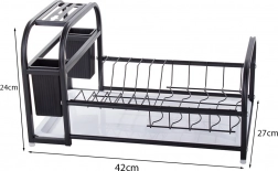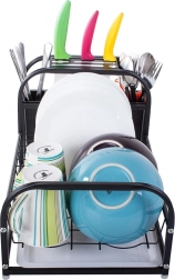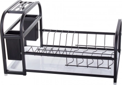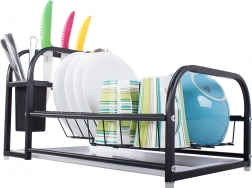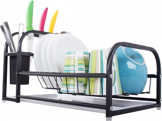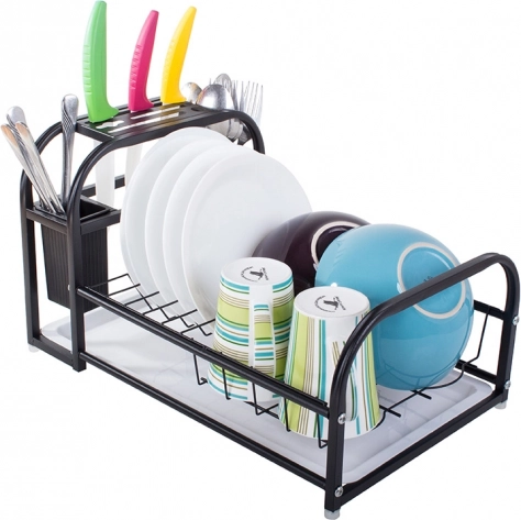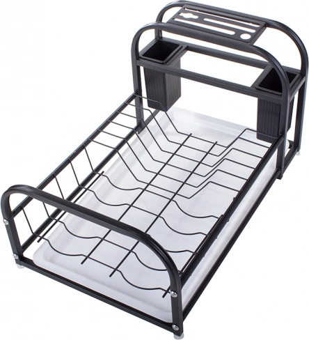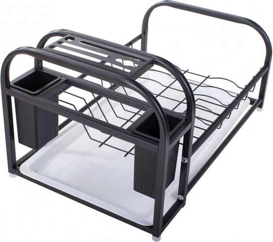 Ovaj moderni ocjeđivač za posuđe kombinira čvrst metal s praškastim premazom i izdržljive plastične komponente. Otporan je na vlagu i oštećenja, pa je odličan za svakodnevnu upotrebu u prometnoj kuhinji. Loft dizajn u elegantnoj crnoj boji lako se uklapa u svaki interijer i postaje funkcionalan ukras radne plohe.