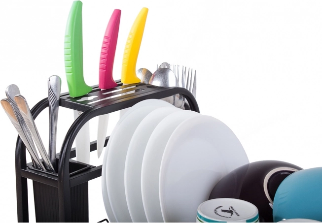 Ocjeđivač prima sve što trebate odložiti nakon pranja: ima vertikalni odjeljak za tanjure (do 5 komada), prostor za zdjelice, šalice i čaše, a tu su i dvije pregrade za pribor te držač za noževe za sigurno i pregledno sušenje. Plastična kadica pouzdano hvata kapljice vode, pa radna ploha ostaje suha i bez mrlja.