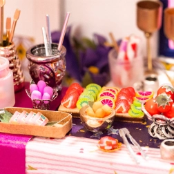Minijatura sadrži detaljne elemente, kao što su šarene stolice, stolovi i druge dekoracije, koje vjerno oponašaju stvarno okruženje.