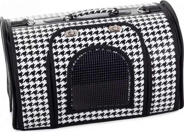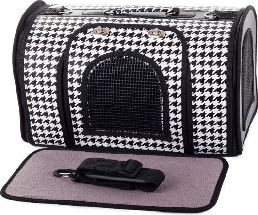 Stilska i izdržljiva transportna torba za pse, mačke i male životinje s pepito uzorkom osigurava sigurno i udobno putovanje u javnom prijevozu, vlaku i do veterinara. Nudi tri prozračna prozora, tri ulaza s patentnim zatvaračem uključujući prednji sa sigurnosnom bravom, karabiner za pričvršćivanje ogrlice/ham i izvlačivu podlogu za lako čišćenje. Zahvaljujući mekanoj ručki i podesivom ramenom remenu ugodno se nosi, a vodootporan materijal i stabilizacijske nožice štite sadržaj.
