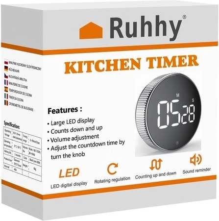 Praktični digitalni timer RUHHY s velikim LED zaslonom, magnetnim pričvršćenjem i funkcijom štoperice olakšava kuhanje, trening i igre. Nudi podesivu glasnoću, precizno odbrojavanje do 99 min 55 s i jednostavno upravljanje jednim dodirom.