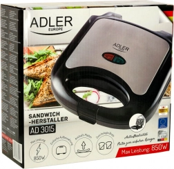 Uživajte u brzim doručcima i večernjim zalogajima s tosterom za sendviče ADLER AD 3015. Kompaktan uređaj s neprianjajućim pločama stvara savršeno zapečene trokutaste tostove bez lijepljenja. Svjetlosne lampice vode vas od zagrijavanja do trenutka kada je uređaj spreman za uporabu.
