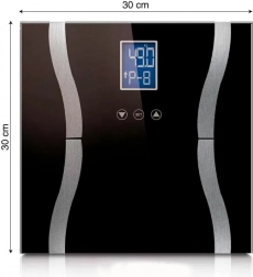 Stilska staklena vaga s preciznim mjerenjem i preglednim LCD zaslonom uklapa se u svaku kupaonicu. Robusna površina od kaljenog stakla debljine 6 mm, zaobljeni rubovi i protuklizne nožice osiguravaju sigurnost i stabilnost pri vaganju. Vaga nudi automatsko vraćanje na nulu, automatsko isključivanje (AUTO OFF) i jednostavno upravljanje tipkom SET.