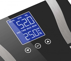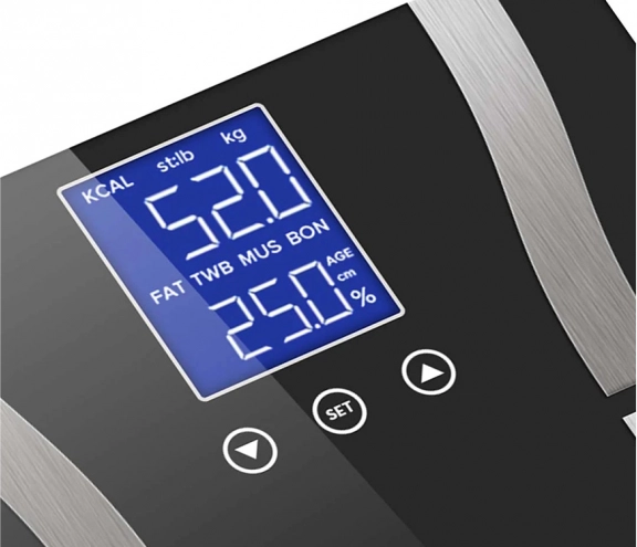 - težina, tjelesna masnoća %, voda %, mišićna masa %, koštana masa %, BMR, pokazatelj stanja (pothranjenost / normalno / prekomjerna težina / pretilost)