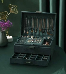 Ova prostrana kutija također je zaštićena izdržljivim materijalima koji pružaju zaštitu od oštećenja, udaraca i prašine. Njen elegantan dizajn sa srebrnim detaljima daje klasičan izgled i estetsku privlačnost, tako da vaš nakit izgleda sjajno gdje god ga postavite.