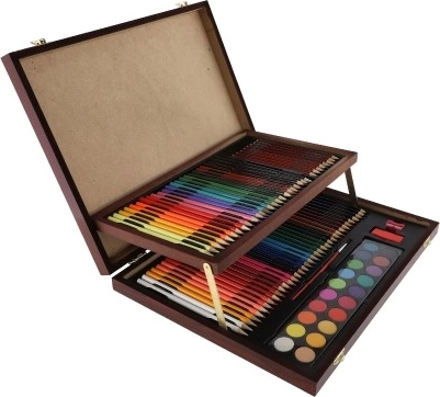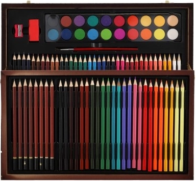 Otkrijte kompletnu umjetničku opremu, idealnu za male i veće umjetnike. Ovaj praktični set u elegantnom drvenom kovčežiću nudi sve potrebno za slikanje i crtanje, uključujući bojice, šiljilo, gumicu i vodene boje, ukupno 91 komad.