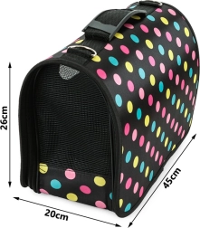 Ovaj proizvod je pogodan za različite vrste životinja kao što su zečevi, lasice, zamorci, mačke i psi. Boja torbe je crna s točkicama.
