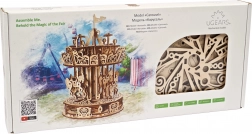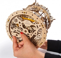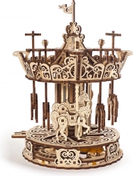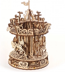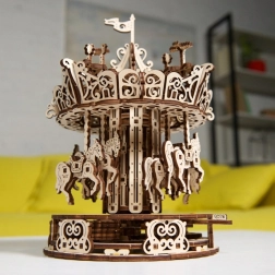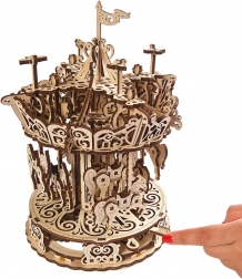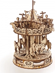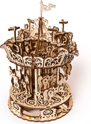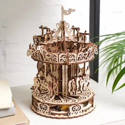Priuštite si elegantan vrtuljak od kvalitetne šperploče koji spaja nostalgiju s pametnom mehanikom. Zahvaljujući gumenom mehanizmu na navijanje središnji stup i krovna kupola vrte se u suprotnim smjerovima, stvarajući optičku iluziju velike brzine. Konjići se glatko podižu i spuštaju, a iznad vrtuljka kruže ptičice – sve je lijepo vidljivo zahvaljujući otvorenom dizajnu.