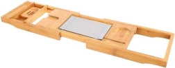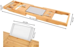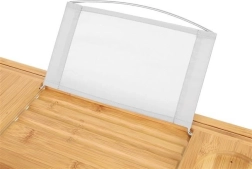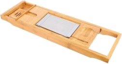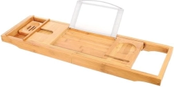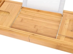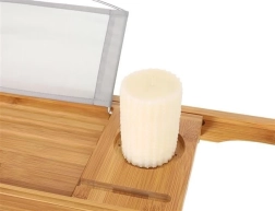 Praktičan raspored nudi stalak za tablet/knjigu s metalnim osloncem i 3 položaja, poseban otvor za čašu, izvadivu sapunjara i umetnu podlogu za ručnik, plus udubljenje za svijeću ili miris. Bambusovo drvo prirodno je otporno na vlagu, lako se održava i u kupaonici djeluje elegantno.