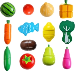 Otkrijte drveni set koji svako dječje kuhanje pretvara u zabavnu i poučnu avanturu. Realistično izrađeno voće, povrće i riba podijeljeni su na dijelove i povezani čičak trakama, pa ih djeca mogu sigurno rezati i ponovno spajati. Žive boje privlače pažnju i motiviraju na istraživanje okusa i oblika.