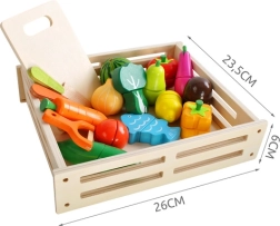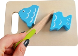 Segmentirano voće, povrće i riba zahvaljujući čičak trakama lako se “režu” drvenim nožićem i ponovno spajaju. Odličan trening fine motorike i igre uloga.