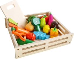 Šareni drveni set voća i povrća u praktičnom sandučiću nudi realističnu igru kuhinje, dućana i kuhanja. Dijelovi se zahvaljujući čičak trakama lako “režu” i ponovno spajaju, a ne nedostaju 2 nožića, daska za rezanje i imitacija gulilice. Igra potiče finu motoriku, maštu te učenje boja i naziva namirnica.