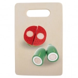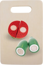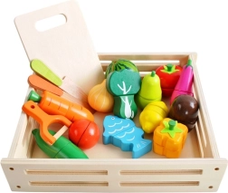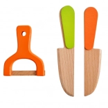 Dio seta je sandučić za pregledno odlaganje, 2 drvena nožića, daska za rezanje i imitacija gulilice. Set razvija finu motoriku, koordinaciju oko–ruka, kreativnost i suradnju u zajedničkoj igri. Odlično za dječju kuhinjicu, vrtić i putovanja.