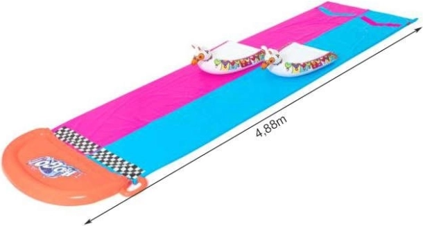 Dvije paralelne staze duljine 4,88 m omogućuju djeci utrkivanje i dugi, brzi kliz uz vodene raspršivače duž cijele staze.
