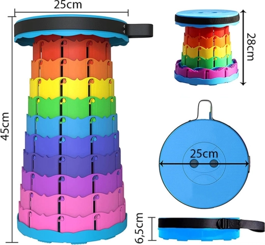Lagana i kompaktna sklopiva stolica za izlete, kampiranje i ribolov. Zahvaljujući teleskopskoj konstrukciji brzo se rasklapa i sklapa, nudi 10 razina visine, podesiv remen za lako nošenje i nosivost do 150 kg. Šareno izvedenje dodat će stilu vašoj opremi.