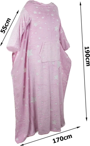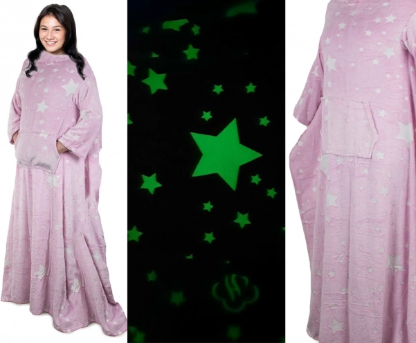 Ova udobna kućna deka s rukavima spaja toplinu, slobodu kretanja i razigran dizajn. Fluorescentni uzorak nakon izlaganja svjetlu svijetli u mraku, što će razveseliti i djecu i odrasle. Univerzalna XXL veličina prilagođava se većini figura i ne klizi kao obične deke.