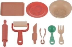Set uključuje siguran nož, vilicu, žlicu, zdjelu, pladanj i druge alate koji podupiru kreativnu igru i pomažu djeci razviti njihovu maštu.
