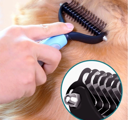 Trimer je dizajniran s gumenom drškom koja sprječava klizanje iz ruku, tako da možete raditi bez straha od umora ili ozljede. Idealan je za srednje i velike pse, mačke i konje. Ova alatka je značajno učinkovitija od običnih četki i češljeva, smanjuje opadanje dlake do 90 %.