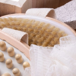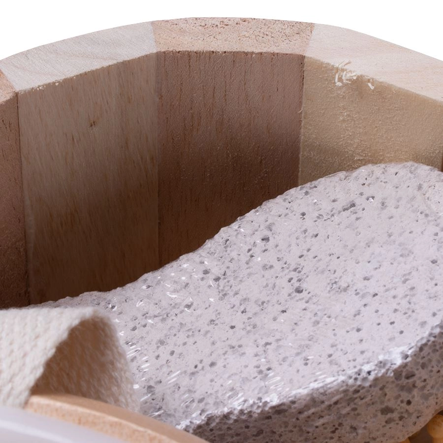 Masažna četka s drvenim čvorićima, nježna četkica i plovućac pomažu ukloniti zadebljalu kožu i potaknuti cirkulaciju.