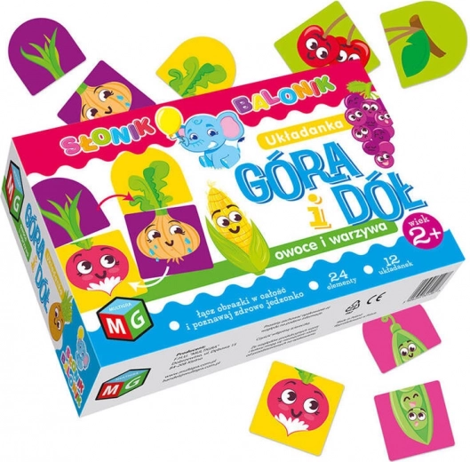 Igra Gore i dolje: voće i povrće idealna je prva slagalica za djecu i njihove roditelje. Zadatak je pronaći ispravne parove tako da se gornji dio slike podudara s donjim. Šarene pozadine olakšavaju snalaženje i pomažu brže složiti cijelu sliku.