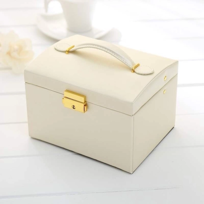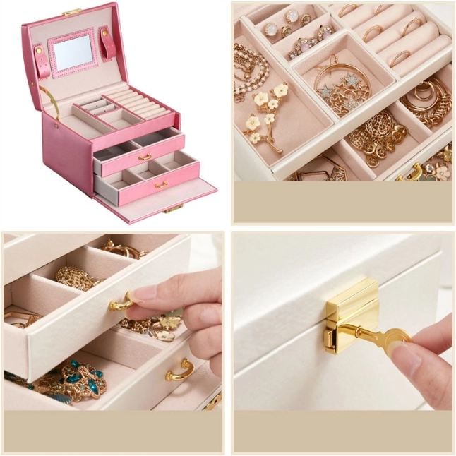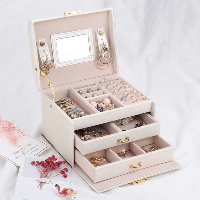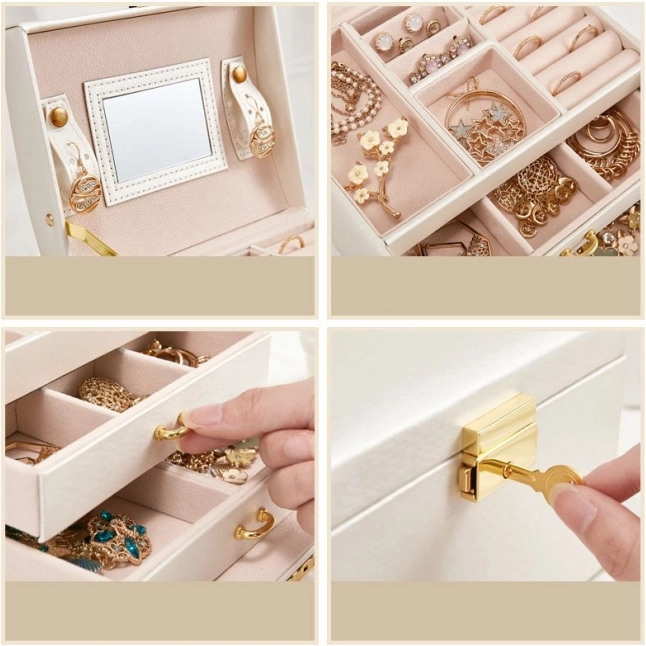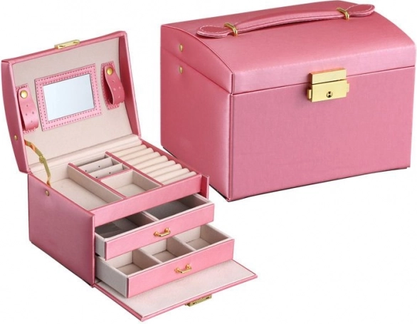 Među osobnim stvarima svake žene važnu ulogu imaju nakit. Višeslojna kutija za nakit je nezaobilazan i pouzdan proizvod za pohranu vaših dragocjenosti. Odvojeni pretinci i ladice pružaju savršeno mjesto za naušnice, narukvice, satove, lančiće, naočale i druge vrijednosti. Kutija za nakit eliminira problem lančića zapetljanih jedan u drugi, habanja i ogrebotina. Mekana podstava štiti vaš dragocjeni nakit od ogrebotina. Kutija ima veliko odvojivo ogledalo, koje je pogodno i za isprobavanje nakita i za šminkanje.