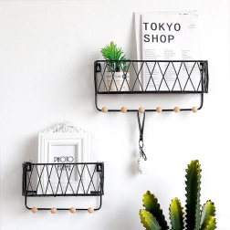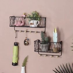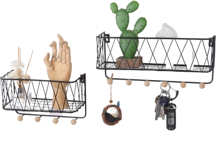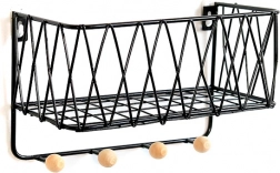 Moderna žičana polica spaja dizajn i funkcionalnost. Gornja odlagna površina prima dekoracije i sitne predmete, dok donje kuke drže ključeve, marame ili lagane torbe uredno obješene. Crna izvedba lako se uklapa u većinu interijera i djeluje čisto i bezvremenski.