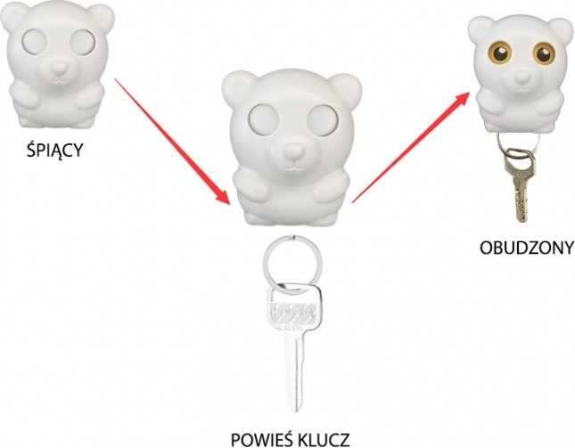 Vješalica za ključeve, idealna za predsoblje, gdje ćete moći objesiti ključeve čim dođete kući. Nakon vješanja ključeva medvjedić otvara oči kako bi pazio na njih. Zahvaljujući montaži vješalice odmah uz izlaz više nikada nećete zaboraviti ključeve – otvorene oči medvjedića sigurno će vas podsjetiti.