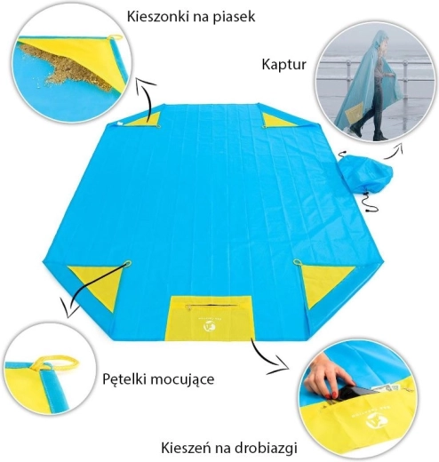 Vodootporna piknik deka za plažu i obiteljske izlete služi i kao kabanica. Na svakom je kutu petlja kako biste deku mogli pričvrstiti sidrima za tlo. Svaki kut opremljen je i džepom koji možete napuniti pijeskom kako je vjetar ne bi podigao. Materijal od kojeg je deka izrađena osigurava najvišu udobnost pri korištenju, vodootporan je te ne propušta vlagu ni vjetar.