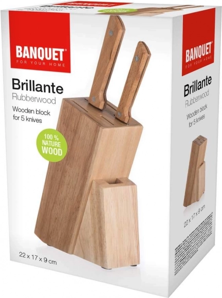 Praktičan drveni blok za 5 noževa i škare BRILLANTE dimenzija 22 × 17 × 9 cm drži vaše kuhinjske noževe uvijek pri ruci. Izrađen je od izdržljivog tropskog drveta kaučukovca i opremljen protukliznim nožicama za stabilnost na radnoj plohi. Moderan dizajn i uštedu prostora čine ga elegantnim dodatkom svakoj kuhinji.