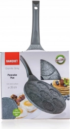 Tava BANQUET Granite Gray Smile razveselit će i djecu i odrasle. Sedam okruglih udubljenja (8 cm) stvara ravnomjerno pečene palačinke, crêpeove ili jaja na oko zahvaljujući masivnom korpusu debljine 4 mm s izvrsnom akumulacijom topline. Neljepljiva dvoslojna površina Dyflon minimalizira prijanjanje i olakšava kuhanje s manjom količinom ulja.