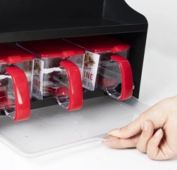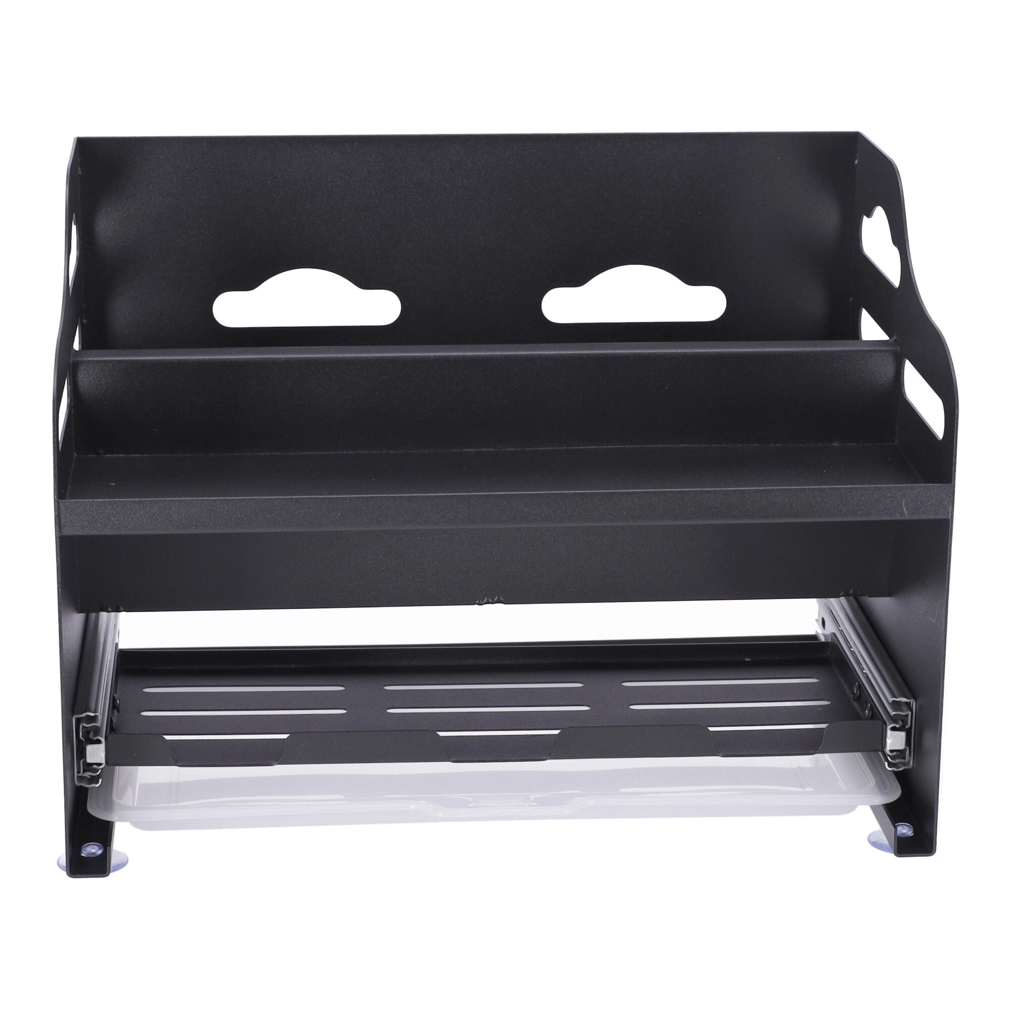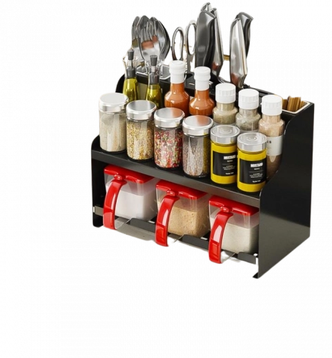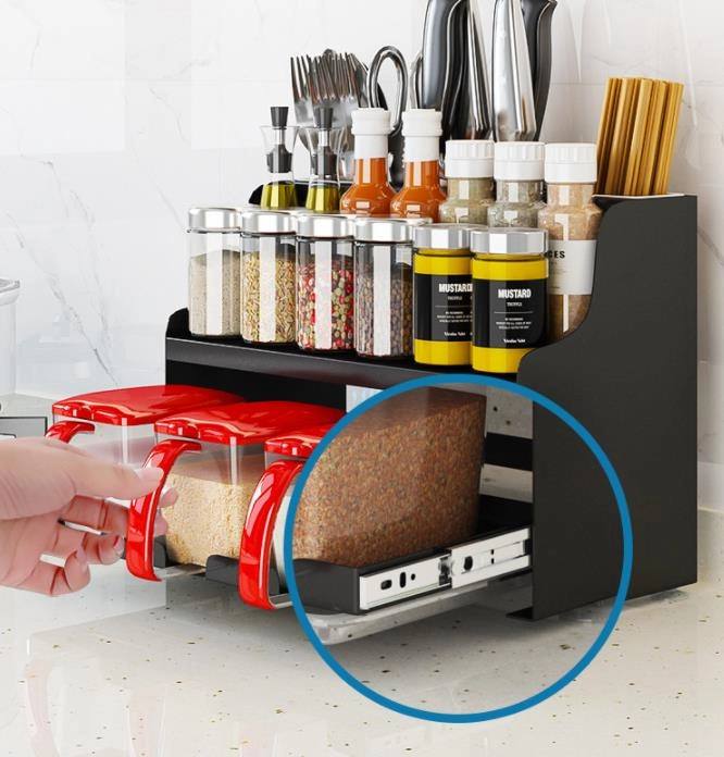 Dvourazinska konstrukcija omogućuje praktično spremanje staklenki sa začinima, konzervi, boca s uljem i visokih posuda na vrhu, dok dolje ostaje mjesto za šećer, brašno ili kavu. Prednji uvlačni spremnici i gornji utori idealni su za kuhače, kliješta, pjenjače i druge kuhinjske alate.
