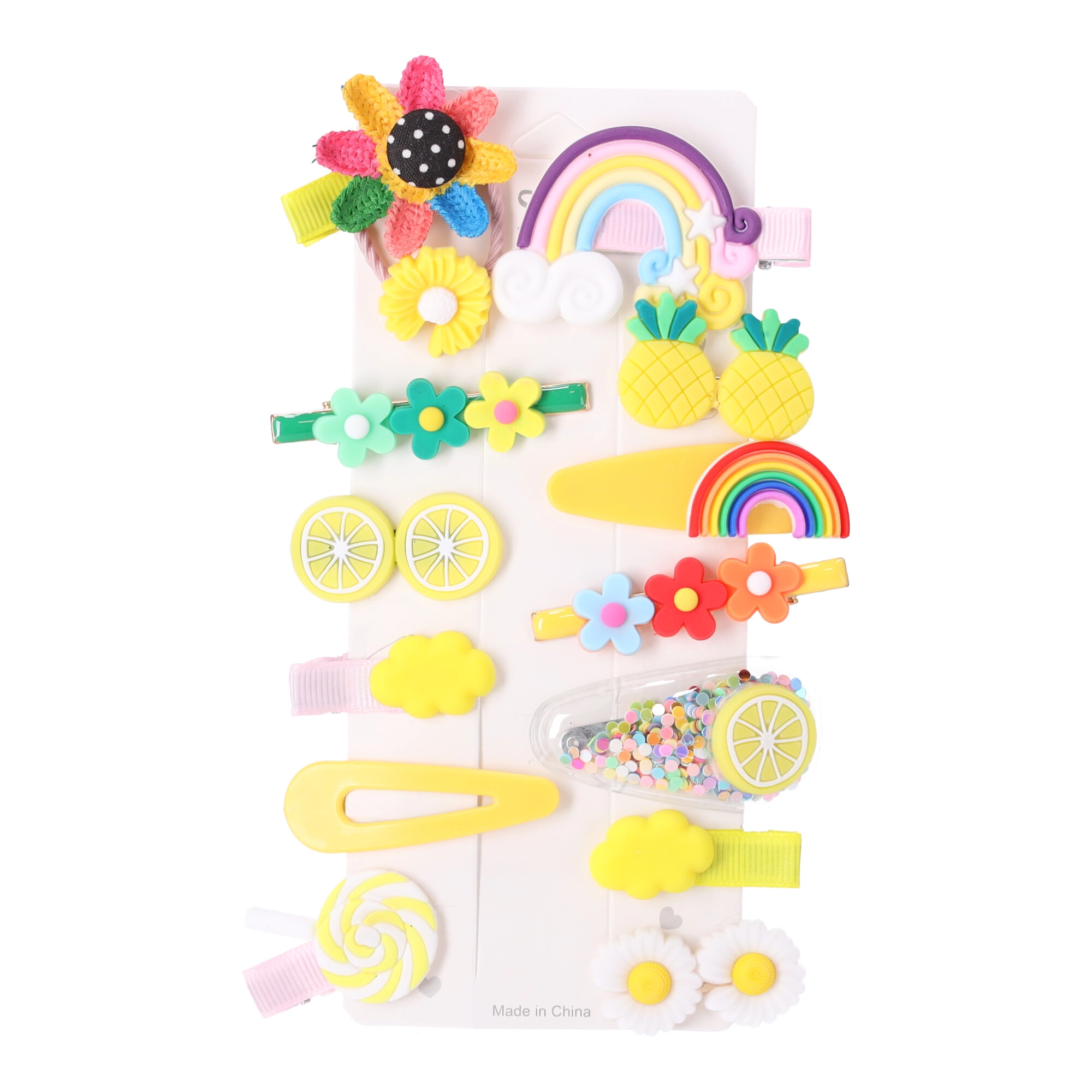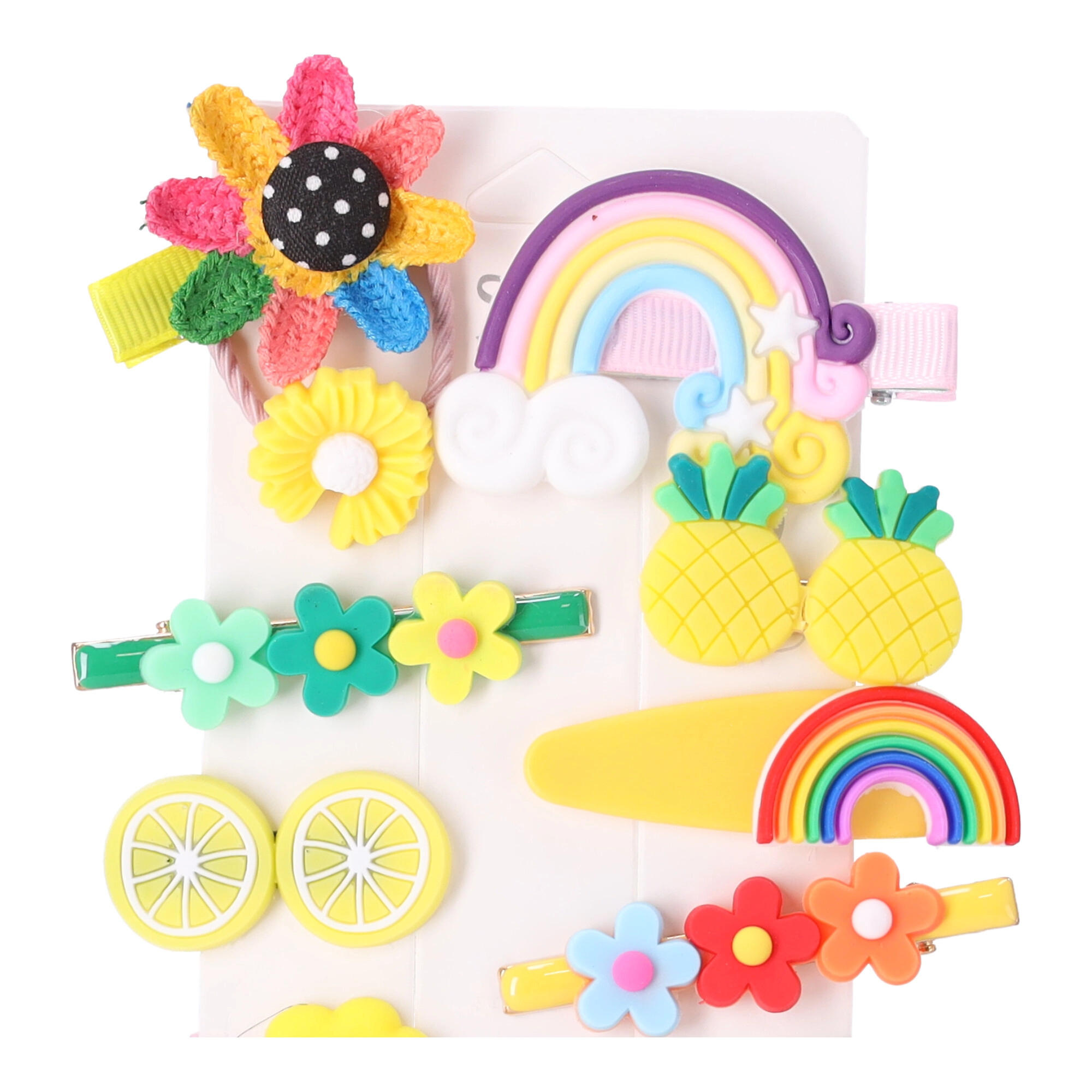 Set od 14 kom uključuje cvijeće, duge, voće i oblačiće u pastelnim i blještavim nijansama. Lako se usklađuju s odjećom i prigodom.