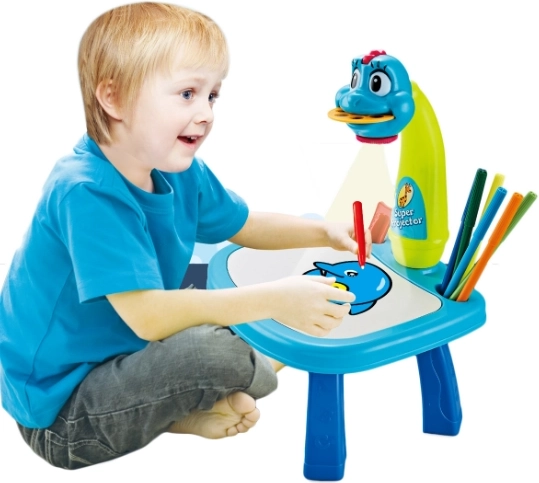 Multifunkcionalni projektor za učenje crtanja u obliku plavog dinosaura projicira slike izravno na podlogu, pa dijete lako može precrtati obris i zatim obojiti crtež. Kroz zabavnu igru vježba maštu, koordinaciju oko–ruka i sigurnost u crtanju. Priloženi dijapozitivi s predlošcima i kolor flomasteri osiguravaju mnoštvo ideja i radosti stvaranja.