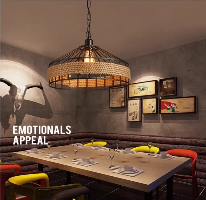 Ova stropna lampa spaja vintage stil s modernim detaljima i bit će savršena dekoracija za vaš dnevni boravak ili blagovaonicu, osobito kao rasvjeta iznad stola, klupe ili šanka. Lampa će se odlično uklopiti i u moderne restorane, hotele, kafiće i barove zahvaljujući svom originalnom dizajnu i čvrstoj izradi od metala i konopnog užeta. Visi na originalnom lancu i ima standardno E27 grlo za žarulju.