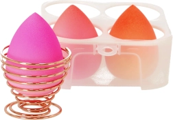 Set triju spužvica za šminkanje + stalak ukrasit će i obojiti površinu vašeg toaletnog stolića! Set je pakiran u praktičnoj kutijici. Praktični stalak omogućuje udobno odlaganje i sušenje kozmetičkog blendera. Stalak je izrađen od metala u boji roza zlata.