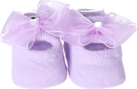 Mekane ljubičaste papučice za bebe s ukrasnom mašnom i malim okruglim draguljem za dodatni stil.